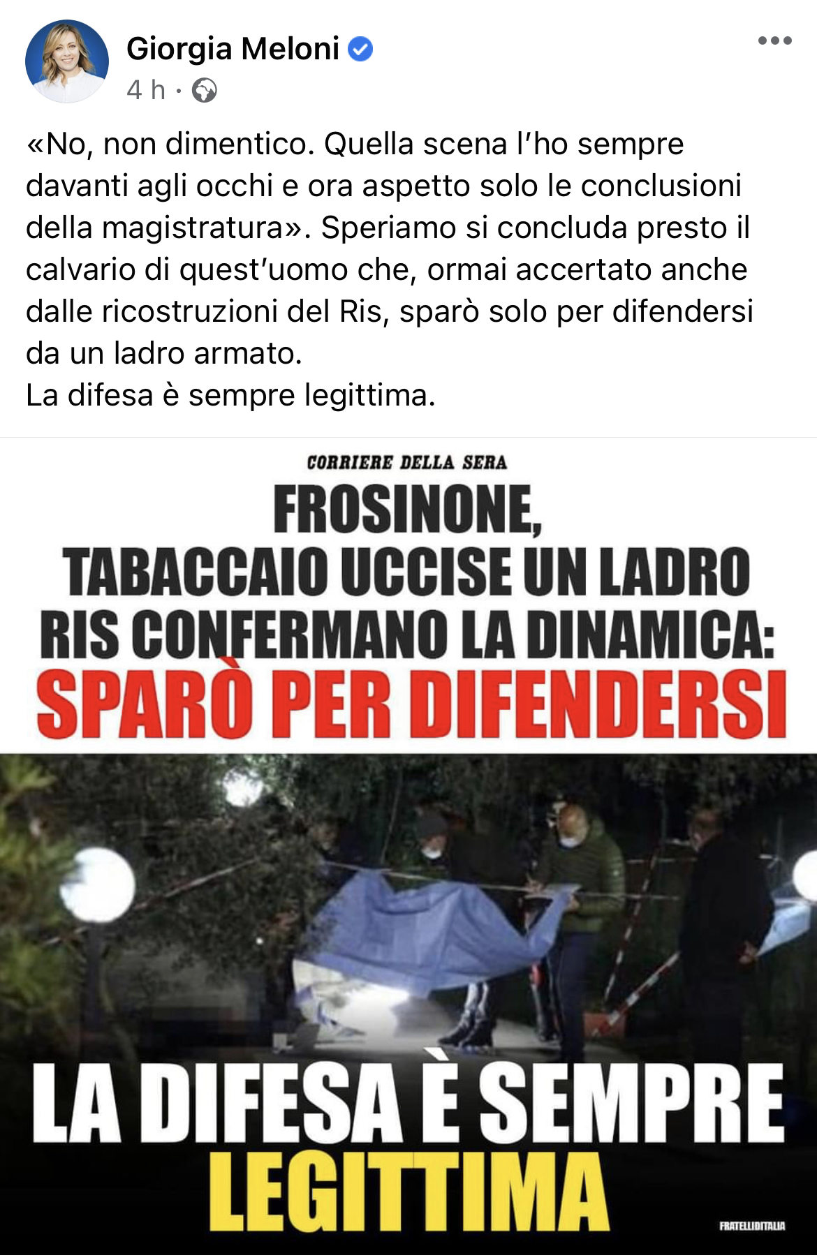 “No, non dimentico. Quella scena l’ho sempre davanti agli occhi e ora aspetto solo le conclusioni della magistratura’. Speriamo si concluda presto il calvario di quest’uomo che, ormai accertato anche dalle ricostruzioni del Ris, sparò solo per difendersi da un ladro armato. La difesa è sempre legittima”. Ha scritto sulla sia pagina Facebook il presidente di Fratelli d’Italia, Giorgia Meloni.