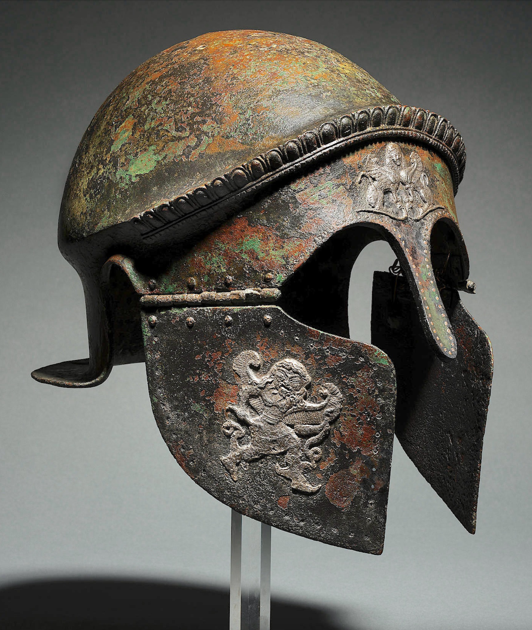 “L’elmo di tipo calcidese, datato alla fine del V secolo a.C., mostra delle eccezionali applicazioni in argento: una doppia sfinge sopra la protezione del naso e due gorgoni alate che corrono, sugli zigomi.