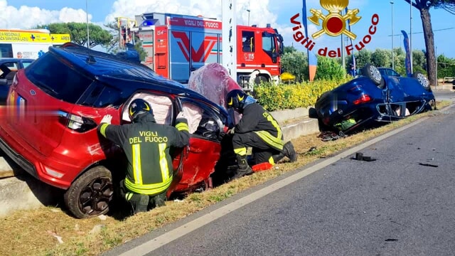LANUVIO (RM) – Grave incidente nel pomeriggio di ieri a Lanuvio. Due auto che stavano percorrendo la Strada provinciale 2, per cause che devono ancora essere accertate, si sono scontate proprio al confine con il territorio comunale di Aprilia. L’impatto è stato violento e una delle due auto si è ribaltata: è stato necessario l’intervento dei Vigili del Fuoco per estricare dalle lamiere gli occupanti i due veicoli. Il bilancio finale del sinistro è di quattro feriti, tra cui anche un neonato di poche settimane. Sul posto sono accorse diverse ambulanze del 118 e la Polizia locale per effettuare i rilievi che saranno preziosi per poi ricostruire la dinamica dell’incidente.