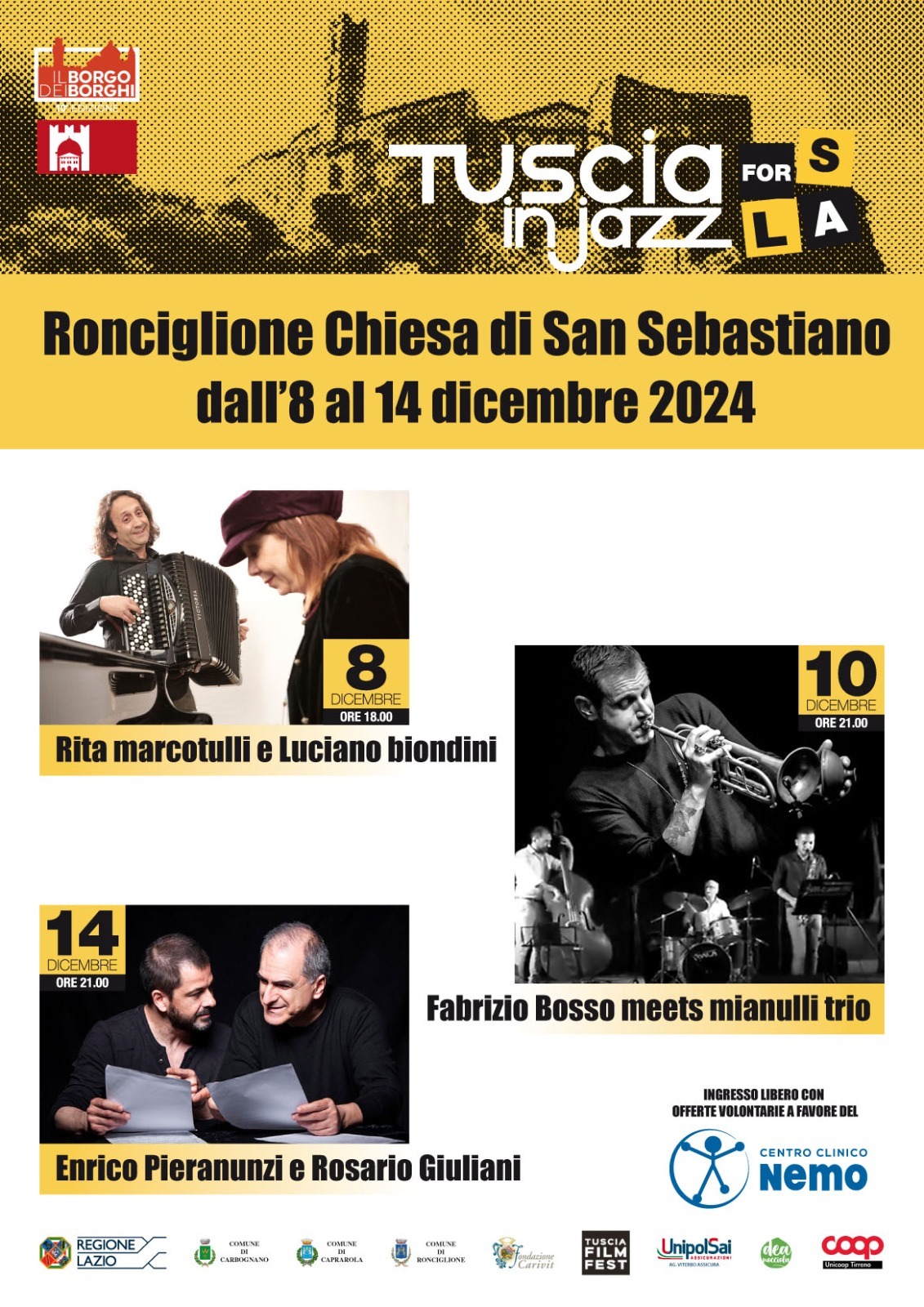 RONCIGLIONE – Dopo il successo del concerto di Rita Marcotulli, Tuscia in Jazz for SLA propone a Ronciglione un altro grande appuntamento a sostegno della ricerca contro la SLA.