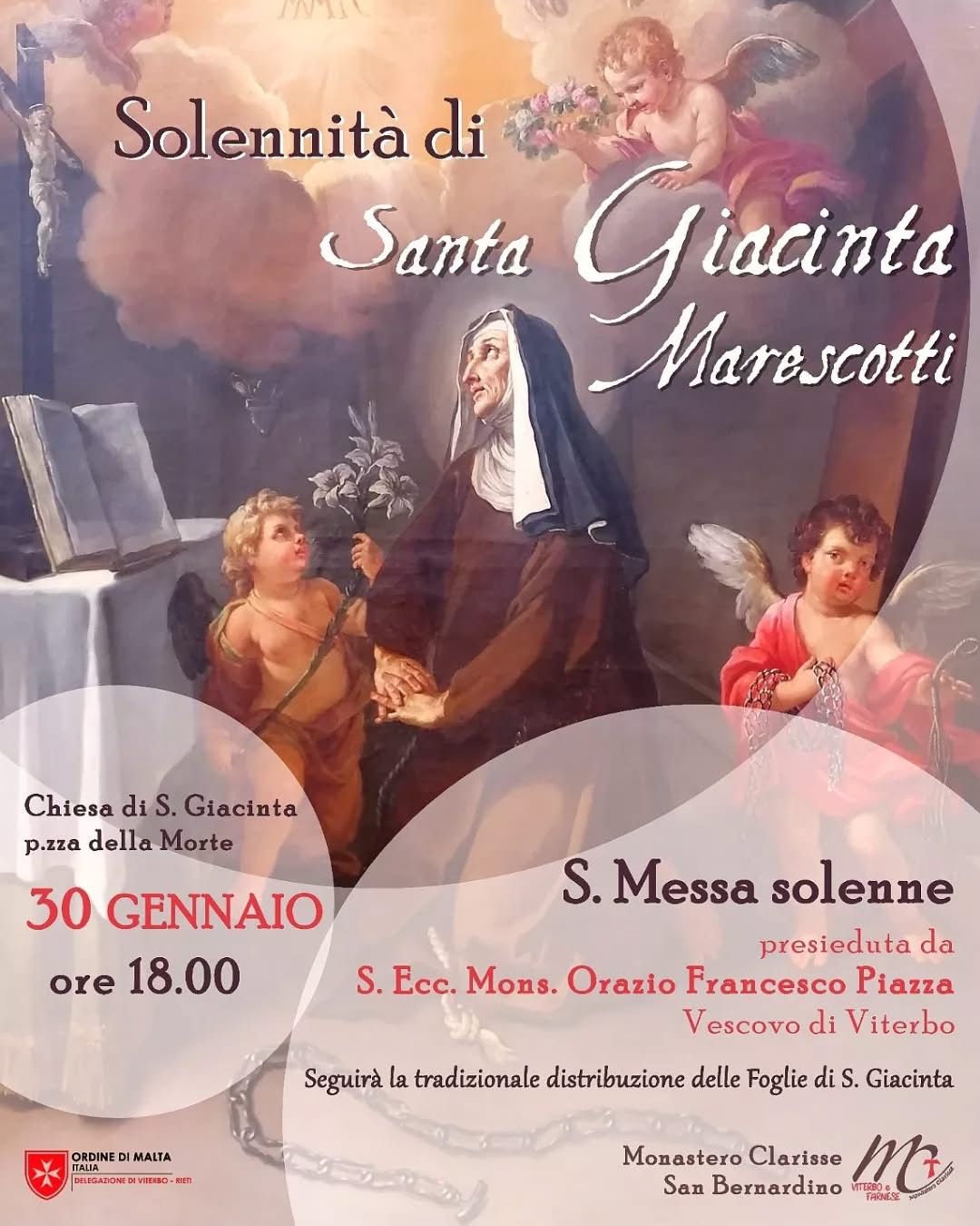 VITERBO – Il 30 Gennaio si celebra a Viterbo la festa di Santa Giacinta Marescotti. Il Vescovo Mons. Orazio Francesco Piazza, come tradizione, presiederà una Celebrazione Eucaristica nella Chiesa a Lei dedicata (a Piazza della Morte) e dove si conserva il corpo della Santa.