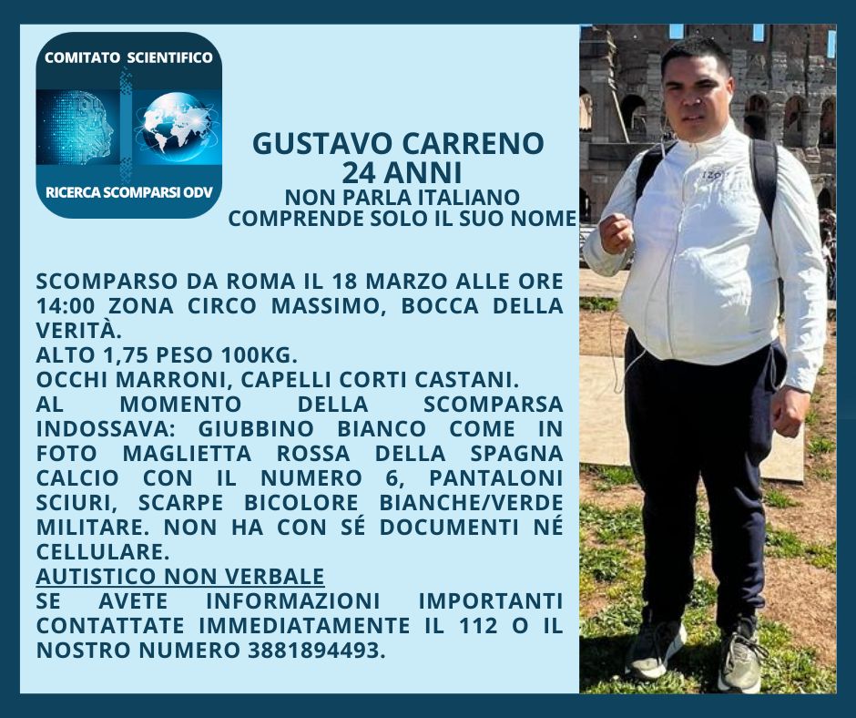 ROMA – Massima allerta per la scomparsa, nella giornata di ieri, di Gustavo Carrena.
