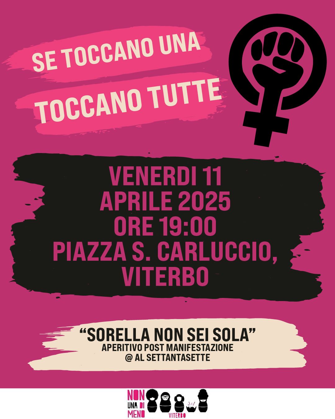 VITERBO – Venerdì 11 aprile ore 19:00 in Piazza San Carluccio a Viterbo Non Una Di Meno Viterbo promuove il presidio “Se toccano una, toccano tutte”, contro la violenza di genere e per reagire all’escalation di femminicidi avvenuti nei primi mesi dell’anno. Tra loro Sara Campanella e Ilaria Sula, uccise negli ultimi giorni a poche ore di distanza l’una dall’altra. Nomi che chiedono voce.