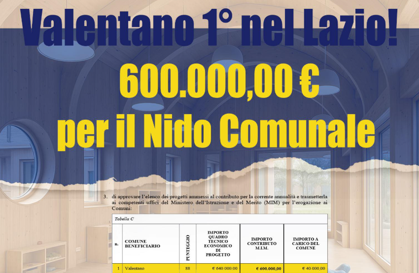 VALENTANO – Una notizia che segna un passaggio fondamentale nel percorso educativo del nostro territorio: il Comune di Valentano ha ottenuto il finanziamento massimo previsto dalla Regione Lazio, pari a 600.000 euro, per la realizzazione di un nido comunale che andrà a completare l’attuale scuola dell’infanzia, trasformando il plesso esistente in un moderno polo 0-6.