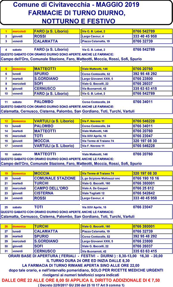 TURNI FARMACIE MAGGIO 2019