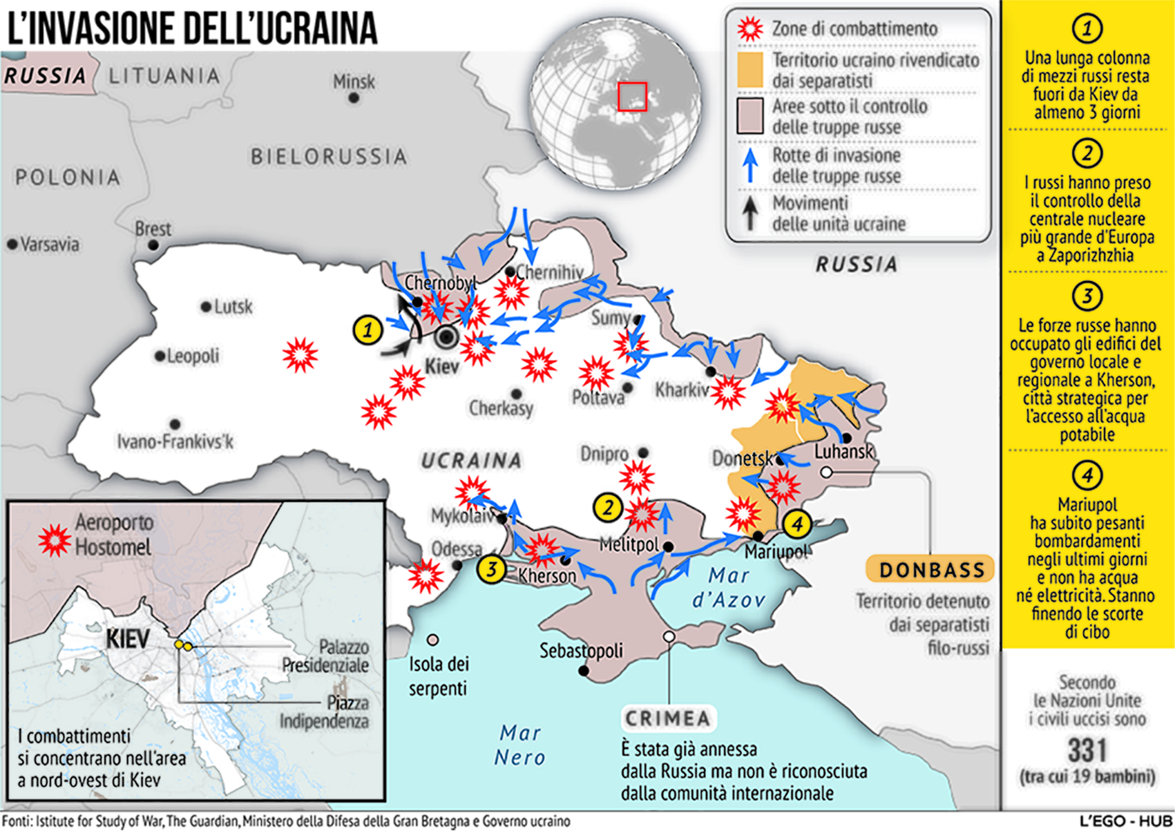 ROMA – Guerra Ucraina-Russia, le forze russe sono ancora a 25 chilometri a nord dal centro di Kiev, mentre si trovano ad una decina dal centro di Chernihiv e Kharkiv. Lo affermano fonti del Pentagono, sottolineando che 10 chilometri «vale a dire che si trovano alle porte della città», vista la loro estensione.