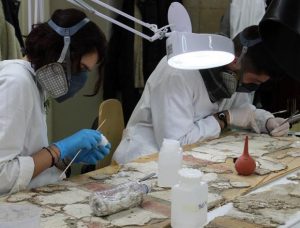 Per questo motivo, da qualche anno sono in corso degli studi per individuare tecniche di restauro alternative, efficaci ma allo stesso tempo meno aggressive. Preziose da questo punto di vista sono le ricerche incentrate su alcuni oli essenziali e idrolati, prodotti di origine naturale noti per la loro spiccata azione anti-batterica e anti-fungina. “Il Silenzio – spiega la microbiologa Maura Di Vito, ricercatrice in Microbiologia e Microbiologia clinica presso l’Università Cattolica, campus di Roma – presentava una colonizzazione da biodeteriogeni fungini sulla parte posteriore della tela. Con la dottoressa Debora Minotti, restauratrice, la dottoressa Daphne De Luca, restauratrice e docente a contratto dell’Università di Urbino e la professoressa Francesca Bugli, mia collega, stiamo portando avanti da anni delle ricerche sull’impiego degli oli essenziali e degli idrolati nei restauri. Avendo già completato tutta la sperimentazione in vitro e verificato l’efficacia di queste sostanze su alcune tele dipinte antiche, abbiamo chiesto le opportune autorizzazioni alla Direzione degli Uffizi per utilizzare questo trattamento su ‘Il Silenzio’, una tela del 1572 dipinta da Jacopo Zucchi, pupillo di Giorgio Vasari. La proposta di restauro ‘green’ è stata accolta positivamente, così siamo partite con un lavoro in tandem tra Roma e Firenze”. Dopo aver spruzzato il mix sul retro della tela e avervi posizionato sopra un foglio di carta assorbente imbevuto dello stesso mix, il quadro è stato alloggiato dentro una sorta di grande busta di Melinex (un film in poliestere monosiliconato utilizzato in alcune fasi di restauro). La tela così preparata è stata adagiata su una tavola riscaldante e aspirante per le prime ore; poi è stata lasciata tutta la notte nella busta a tavola spenta. Il riscaldamento è servito a far entrare i funghi nella fase di replicazione, che rappresenta il loro tallone d’Achille, e permettere al trattamento di agire al meglio neutralizzando i biodeteriogeni. Il giorno successivo è stato rimosso tutto e la tela è stata fatta asciugare. Al termine del restauro sono stati quindi ripetuti i tamponi per inviarli a Roma, ripetere le colture e verificare se i funghi fossero ancora presenti. Dalle colture non si è visualizzata alcuna crescita fungina e così “Il Silenzio” è stato restituito al soffitto della Sala delle Carte Geografiche degli Uffizi.