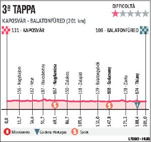 (lunedì sarà giorno di riposo). Si tratta di una classica tappa per velocisti che partirà da Kaposvar (nel sud della repubblica magiara, a pochi chilometri dal confine croato) e terminerà a Balatonfured, sulle sponde del grande lago Balaton, per un totale di 201 chilometri.