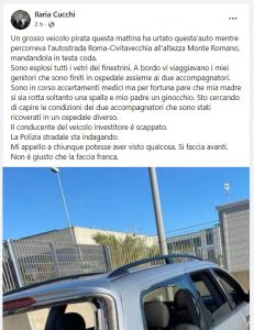 “Un grosso veicolo pirata questa mattina ha urtato quest’auto, mentre percorreva l’autostrada Roma-Civitavecchia all’altezza Monte Romano, mandandola in testa coda – spiega Ilaria Cucchi – Sono esplosi tutti i vetri dei finestrini. A bordo vi viaggiavano i miei genitori che sono finiti in ospedale assieme ai due accompagnatori”. Fortunatamente, continua, le condizioni di salute dei genitori sono buone e, nonostante la paura sia stata tanta, non si trovano in pericolo di vita.