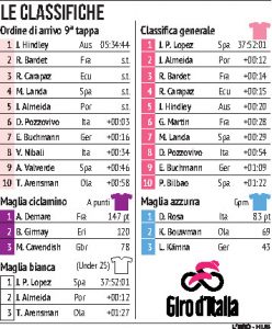 Si tratta di Domenico Pozzovivo che, grazie all’ottimo sesto posto nella tappa della Maiella, è ora 8° a soli 54″ dalla maglia rosa Lopez Perez. A un italiano intanto è andata la maglia azzurra del Gran Premio della Montagna: si tratta del piemontese Diego Rosa che guida la speciale classifica con 14 punti di vantaggio sull’olandese Bouwman.