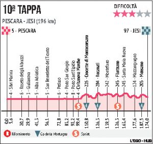 LA TAPPA DI DOMANI. Domani tappa di 196 chilometri da Pescara a Jesi divisa in due parti. Prima parte pianeggiante lungo la statale adriatica, mentre la seconda parte sarà molto nervosa. Da Civitanova Marche in avanti cambia l’altimetria della tappa e, pur senza salite lunghe, ci saranno continui sali-scendi che seguiranno il profilo delle dolci colline