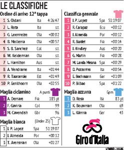 GENOVA – Stefano Oldani vince la dodicesima tappa del Giro d’ Italia di ciclismo, 204 km con partenza da Parma e arrivo a Genova. Oldani prevale in una volata a tre sull’altro azzurro Lorenzo Rota e sull’olandese Gijs Leemreize. Lo spagnolo Lopez Perez, giunto a oltre 9 minuti da Oldani, conserva la maglia rosa, ma il vantaggio dagli inseguitori comincia ad assottigliarsi pericolosamente.