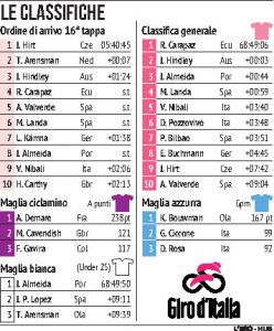 conteneva al suo interno tre gran premi della montagna e soprattutto il tremendo Mortirolo, pericoloso sia in salita sia in discesa. Secondo Thymen Arensman (Dsm), terzo Jai Hindley (Bora-Hansgrohe) davanti al leader della classifica generale Richard Carapaz che resta in Rosa con 3″ di vantaggio sullo stesso Hindley. Vincenzo Nibali chiude nono. Proprio la discesa del Mortirolo vede un guizzo di Nibali che scende a razzo dando lezioni di traiettorie e tenuta di strada a tutti i professionisti, ventenni o no, della Corsa Rosa: iniziativa ai meno 70km che finisce quasi subito, mentre negli stessi istanti l’altro grande vecchio del Giro, Domenico Pozzovivo, subisce l’ennesima caduta in carriera ma si rialza subito, con solo delle sbucciature ai gomiti. “Ho avuto qualche problema durante la tappa. Mi è caduta la catena, poi ho avuto i crampi ma non mi sono mai arreso. Sono contento di essere riuscito a staccare i miei compagni di fuga sull’ultima salita e arrivare da solo al traguardo”, racconta il vincitore della tappa di oggi del Giro d’Italia, Jan Hirt. “Ho sempre detto che il mio risultato più grande sarebbe stato vincere una tappa al Giro d’Italia e adesso sono troppo felice per esserci riuscito”.