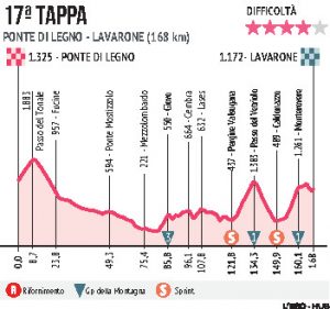di oggi. Sono 168 chilometri per andare da Ponte di Legno a Lavarone, passando così dalla Lombardia al Trentino-Alto Adige. Si comincia attaccando il Tonale e poi una lunga (anche se non troppo ripida) discesa che occuperà una settantina di chilometri. In tutto sono in programma tre Gran premi della Montagna, di cui gli ultimi due (il Valico del Vetriolo e il Monterovere) entrambi di primo categoria. L’ultimo chilometro prima dell’arrivo è in leggera salita.