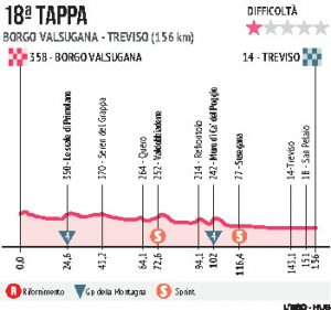 Frazione per velocisti (quelli superstiti) quella che partirà domattina da Borgo Valsugana per arrivare a Treviso 156 chilometri dopo. Tappa quasi del tutto pianeggiante e con numerosi attraversamenti urbani. Una volta arrivati a Treviso, i corridori dovranno affrontare un circuito di circa 11 km da ripetere una sola volta. Verona è sempre più vicina.