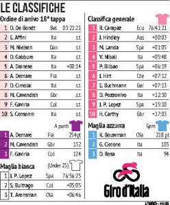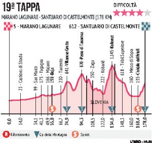LA TAPPA DI DOMANI. Domani si corre la 19esima frazione con partenza da Marano Lagunare e arrivo al Santuario di Castelmonte dopo 178 km. Nuovo tappone alpino adatto agli scalatori con ben quattro Gran Premi della Montagna: uno di prima categoria, uno di seconda e due di terza. Due traguardi volanti e arrivo in salita al Santuario di Castel Monte dopo aver sconfinato in terra slovena.