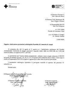 Il Dott. Aliquò ci ha informato che non esistono atti della ASL che hanno autorizzato la chiusura del reparto di Radiologia ad Anagni, ringraziandoci per la segnalazione ed impegnandosi non solo a riaprire immediatamente il reparto ma anche a potenziare e migliorare il servizio di Radiologia della struttura di Via Onorato Capo. La chiusura del reparto è stata dovuta alla mancanza di personale e non ad una iniziativa della ASL”.