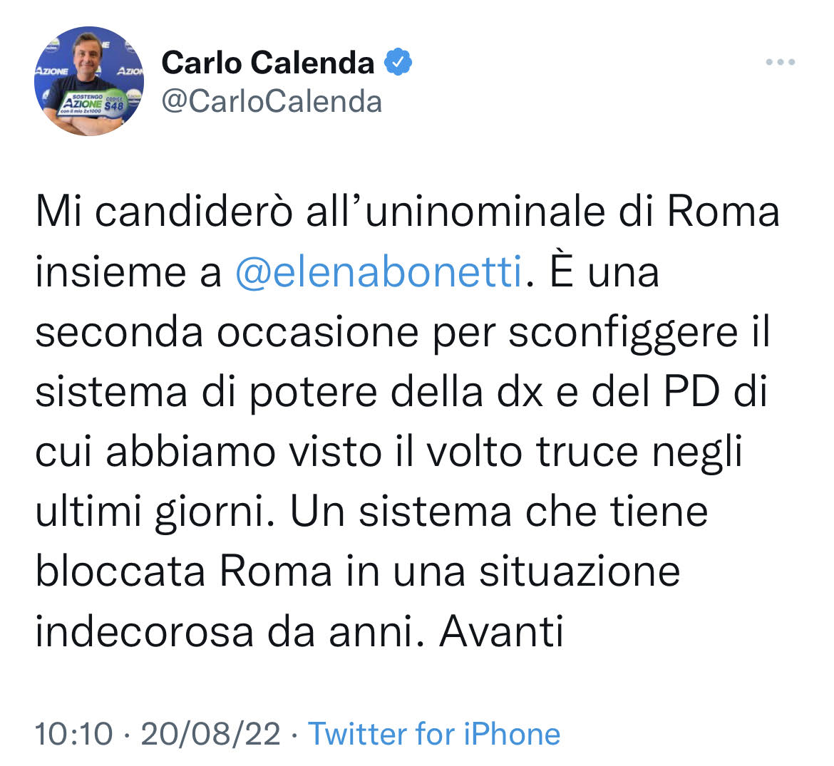 “Mi candiderò all’uninominale di Roma insieme a Elena Bonetti È una seconda occasione per sconfiggere il sistema di potere della destra e del Pd di cui abbiamo visto il volto truce negli ultimi giorni. Un sistema che tiene bloccata Roma in una situazione indecorosa da anni. Avanti”.