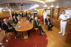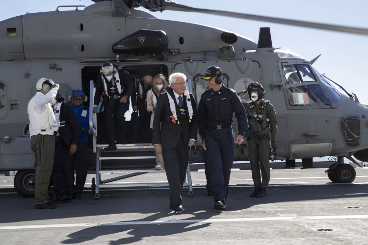 CIVITAVECCHIA – Il Presidente della Repubblica, Sergio Mattarella, ha visitato ieri la Nave militare portaerei Cavour al largo di Civitavecchia, accompagnato dal Ministro della Difesa, Lorenzo Guerini, dal Capo di Stato Maggiore della Marina Militare, Enrico Credendino, dal Comandante in Capo della Squadra Navale, Aurelio De Carolis e dal Comandante della Nave Cavour, Enrico Vignola. Ecco spiegato il via vai di elicotteri che, nel tardo pomeriggio di ieri, ha tenuto con il naso all’insù i civitavecchiesi incuriositi dal passaggio frequente e a bassa quota dei mezzi militari sopra la città. Al capo dello Stato è stato consegnato durante la vista l’equipaggiamento tra cui un cappelli con il nome Mattarella che l’inquilino del Colle ha indossato durante tutta la sua permanenza. «Quello che diceva il comandante è molto importante – ha spiegato il Presidente nel corso della sua visita – come ha detto, “da