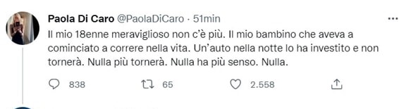 ROMA – Un 18enne, Francesco Valdiserri, è morto nella notte a Roma, investito da un’auto fuori controllo, guidata da una ragazza di 24 anni, che lo ha travolto sul marciapiede. È successo in via Cristoforo Colombo, all’angolo con via Giustiniano Imperatore. La donna ha prestato soccorso alla vittima in attesa del 118, ma per il giovane, che sarebbe stato schiacciato dall’auto contro il muro, non c’è stato nulla da fare. Accanto allo sfortunato ragazzo c’era un’altra persona rimasta illesa. Sulla vicenda indaga il gruppo Marconi della polizia locale. L’investitrice è stata sottoposta agli esami alcolemici e tossicologici di rito. I genitori di Francesco sono due giornalisti del Corriere della Sera, Luca Valdiserri e Paola Di Caro, firme molto note a Roma. Disperato il tweet della mamma: «Il mio 18enne meraviglioso non c’è più. Il mio bambino che aveva cominciato a correre nella vita. Un’auto nella notte lo ha investito e non tornerà. Nulla più tornerà. Nulla ha più senso. Nulla». Francesco avrebbe compiuto 19 anni nei prossimi giorni.