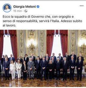Al termine del giuramento la Meloni ha scritto su facebook: “Ecco la squadra di Governo che, con orgoglio e senso di responsabilità, servirà l’Italia. Adesso subito al lavoro”.