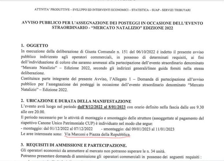 VITERBO – Più che Mercatino è ormai diventato un teatrino, da un lato rappresentanti delle associazioni degli ambulanti che accusano l’amministrazione di averli ignorati, infischiandosene delle loro richieste di non volere fare il Mercato Natalizio fuori del luogo dove si svolge da sempre cioè Piazza del Sacrario, dall’altra il sindaco che vuole mettere un punto alle accuse assolutamente false, come dimostra il bando a cui gli stessi ambulanti avevano, fino a qualche giorno fa aderito, e che recita chiaramente che lo svolgimento del mercatino natalizio è su Piazza della repubblica e via Marconi (vedi foto)