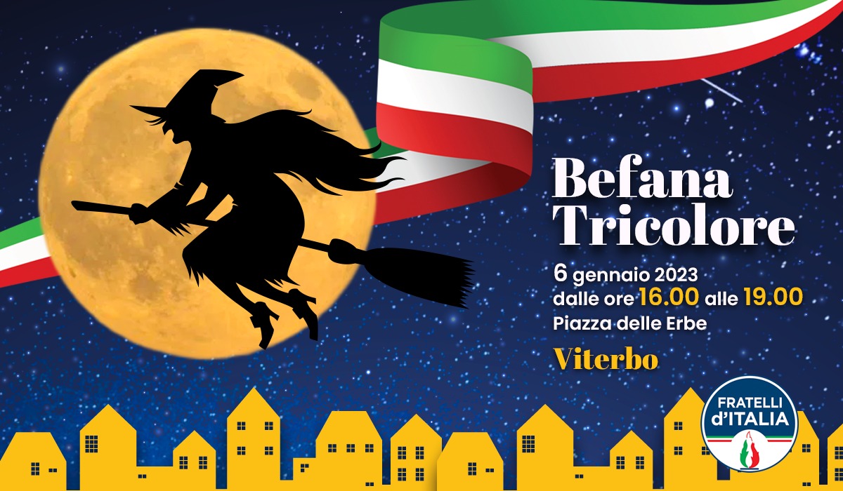 VITERBO – In occasione della tradizionale festa dell’Epifania, Fratelli d’Italia ha organizzato la Befana Tricolore, un evento che aprirà in grande stile questo 2023. Dalle ore 16 fino alle 19, la Befana di Fratelli d’Italia si presenterà a Piazza delle Erbe a Viterbo per regalare gioia e regali per tutti i bambini. La solidarietà dell’evento sarà il fattore fondamentale della Befana Tricolore, con i dolci e le caramelle a fare da supporto a questa iniziativa proposta da Fratelli d’Italia. L’invito, rivolto a tutti i cittadini di Viterbo e della Provincia, sarà un’occasione per dimostrare lo spirito di unione della popolazione, un giorno di festa per l’Italia intera. Evviva la Befana Tricolore!