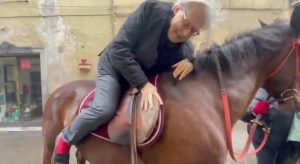 Il primo cittadino, Vittorio Sgarbi, ha ovviamente aperto il corteo e, come sempre, non è passato inossevato: in mocassini e calzini rossi ha montato il suo equino con uno stile “improvvisato” che ha scatenato l’ironia sui social.