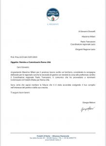 La lettera di Giorgia Meloni a Donzelli, Milani, Trancassini (coordinatore regionale) e tutti i dirigenti nazionali è inequivocabile: “Caro Giovanni, ringraziando Massimo Milani per il prezioso lavoro svolto sul territorio, considerata la campagna elettorale per le regionali e anche la necessità di gestire con terzietà la corsa alle preferenze, sentito il coordinatore regionale Paolo Trancassini, ti comunico che ho provveduto a nominarti commissario di Fratelli d’Italia per Roma città. Sono certa che saprai meritare la fiducia che ti è stata accordata svolgendo il tuo compito nell’interesse del partito e della sua crescita. Ti auguro buon lavoro”.