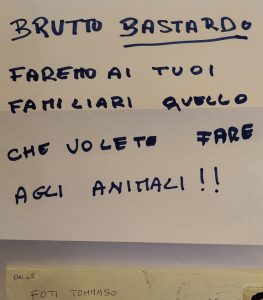 La lettera riporta il seguente testo: “Brutto bastardo faremo ai tuoi familiari quello che volete fare agli animali!!”