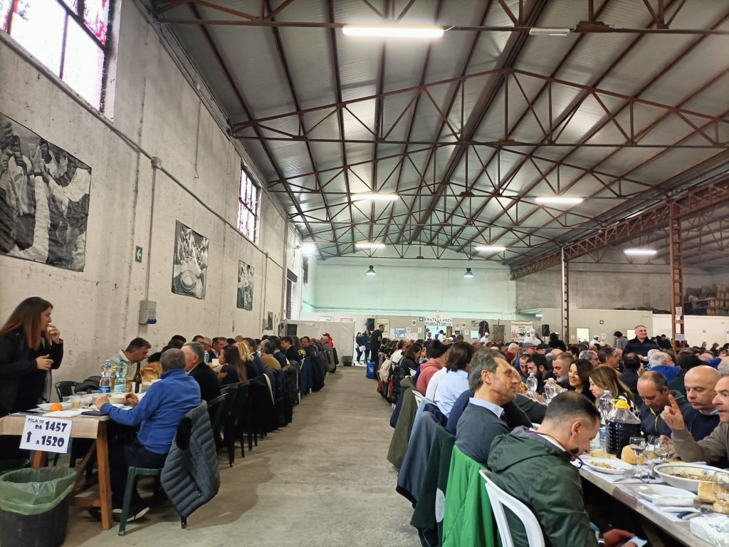 A partire da mezzogiorno le decine e decine di commensali hanno iniziato a riempire la grande sala della Cantina Sociale di Gradoli per prendere posto nelle lunghissime file di tavoli: ogni ospite in questa occasione porta da casa tutto il necessario per apparecchiare (posate, bicchieri, piatti e tovaglioli) e mangia accanto agli altri partecipanti.