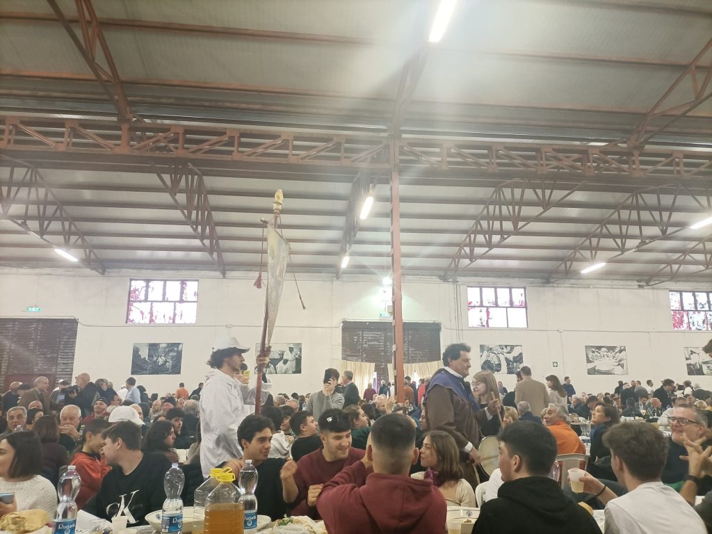 Dopo la seconda portata i membri della Fratellanza del Purgatorio hanno sfilato per tutta la sala tra i tavoli, accompagnando il corteo con il suono del tamburello.