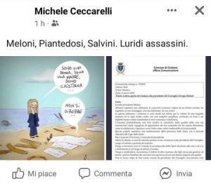 “Dopo la tragedia del mare, l’ennesima, che coinvolge l’Italia, oggi abbiamo letto un post su Facebook da parte del consigliere Ceccarelli che, testualmente, inveisce contro i Ministri Salvini e Piantedosi, presidente del Consiglio compresa Giorgia Meloni, definendoli ‘Luridi assassini’,