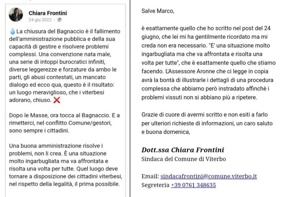 VITERBO – Bagnaccio ancora chiuso. L’unico parco termale ecosostenibile della provincia, continua a non essere fruibile. Circoscritto tra empasse burocratiche, interpretazioni di norme e sentenze del Consiglio di stato che lo hanno portato ad aprire e chiudere a fasi alterne.L’ultima chiusura con l’amministrazione Arena con la risoluzione del contratto di sub concessione del Parco termale Bagnaccio dovuto ad alcune contestazioni mosse proprio dall’allora amministrazione, che i proprietari hanno cercato di adempiere, senza però riuscire a trovare una soluzione. Ed oggi è proprio l’ex sindaco Giovanni Arena a ricordare come qualcuno all’epoca dello stop cavalcò l’onda: “Mi sembra di ricordare che in campagna elettorale qualcuno avesse assicurato che lo avrebbe riaperto in tempi da record!”, afferma tagliente sui social, ed in effetti la stessa Frontini nell’ ultima chiusura del Parco, a maggio 2021, dichiarò ai giornali: “Questi sono i danni di un atteggiamento dilatorio da parte di una politica che non è capace di decidere –è inaccettabile non dare risposte, magari negative, ma rispondere alle associazioni e ai cittadini è un obbligo morale. Un altro fallimento della maggioranza Lega, Forza Italia, Fratelli d’Italia e Fondazione. Se si rimandano le decisioni sine die senza prendere posizione in un senso o nell’altro, ecco i risultati”. Eppure proprio Frontini una volta arrivata a guidare la città si è resa conto di avere a che fare con un caso più intricato del previsto, (sotto il suo post datato 24 giugno 2022 e ripostato in questi giorni da uno dei gestori del Parco) ma che avrebbe fatto di tutto per restituire tale bene ai viterbesi “ogni possibile strada per ridurre i tempi di riapertura dovrà essere valutata, anche prevedendo una qualsiasi forma di concessione e gestione temporanea, nel rispetto delle leggi vigenti”. Soluzione ponte che sembra non esistere come dichiarato dall’assessore al Termalismo Floris nella seconda commissione convocata ieri in comune: “La riapertura è legata alla variante al piano regolatore – come da tempo dichiaravano inascoltati dai banchi dell’opposizione – speriamo di risolvere in tempi brevi” . Tabella di marcia che sarà dettata dall’assessorato all’Urbanistica guidato da Emanuele Aronne e dalla volontà di essere celeri su un patrimonio, non solo economico e culturale ma anche sanitario, che i cittadini reclamano a gran voce.