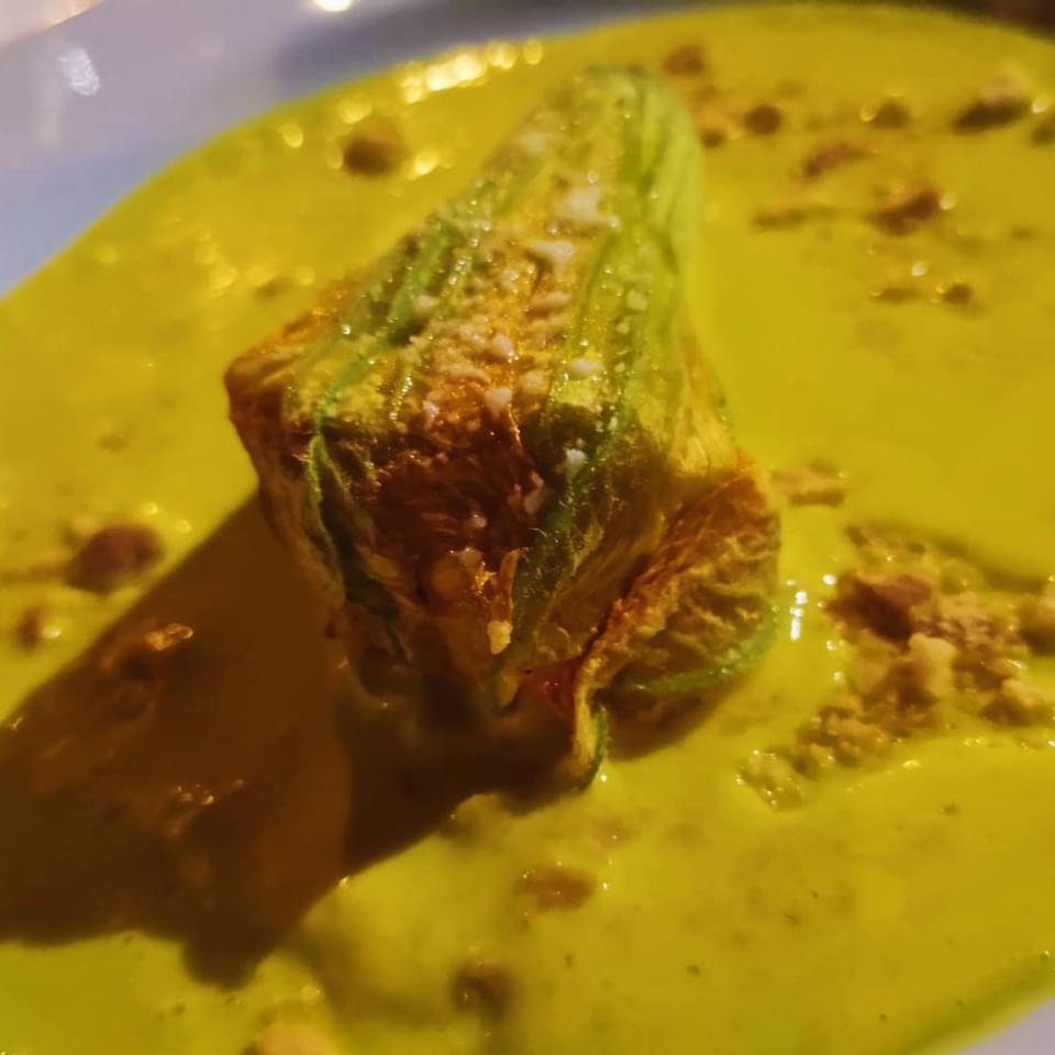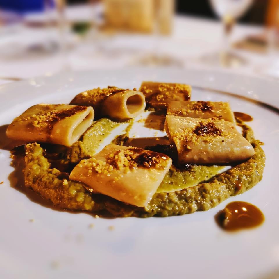 Il benvenuto viene dato da: Pesche bruciate, panzanella liquida e estratto di erbe( Il Casaletto), Zuppetta di Lenticchie di Onano, salsiccia di brado arrostita e olio E.V.O. Doppi Sensi Presidio Slow Food (C.C.O.R.A.V., Il Casaletto, Doppi Sensi). Spalla di brado a lunga stagionatura con pizzetta fritta ( Il Casaletto e Valentini). Si prosegue poi con gli antipasti: Fiore di zucca al forno, ripieno di verdure in olio cottura e ricotta, su tozzata di siero di ricotta allo zafferano e crackers Senatore Cappelli (Piccola Formaggeria Artigiana, Il Radichino F.lli Pira, Il Casaletto, Laura De Parri, Forno Vecchino, Il Casone). Savarin al nobile caprino, olio Tuscia D.O.P. evo schiumato e bieta (Monte Jugo, Il Casaletto, coop. Colli Etruschi). Per primo, paccheri, melanzane, pasta di nocciole nel fondo dei vegetali, sono prodotti con la farina di Aca, cultivar riscoperta da Luca di Piero. A seguire, coniglio leprino fritto dorato, sandwich di polentina al patè del suo fegato e fagiolini dell’orto. (del Consorzio del Coniglio Leprino, Cupidi, Villa S. Ermanno, Il Casaletto). Il Budino di latte con lamponi e meringhe alle nocciole (Alessio Troscia, San Bartolomeo, Luca Di Piero, Il Casaletto), si accompagna all’ Amaro del Conclave dell’Enoteca Viterbium, nuovo prodotto dedicato al capostipite dell’azienda.