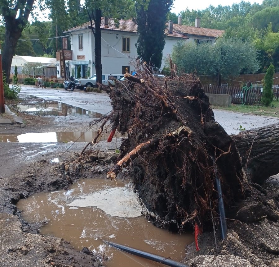 MONTEFIASCONE – I violenti nubifragi che hanno devastato diverse località del nord sembrano essere arrivati nella Tuscia. Da questo pomeriggio la pioggia incessante, accompagnata anche da raffiche di grandine si è fatta sentire nel viterbese. Tra i paesi maggiormente colpiti Montefiascone con il lungolago investito da una vera e propria tromba d’aria, come il ristorante Onassis che ha riportato diversi danni e tanto spavento per il crollo di un albero secolare circa un’ora fa. Sono ora sul posto i vigili del fuoco.