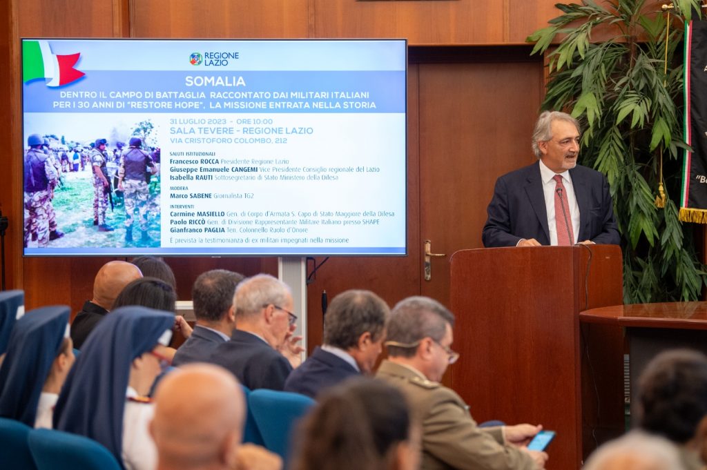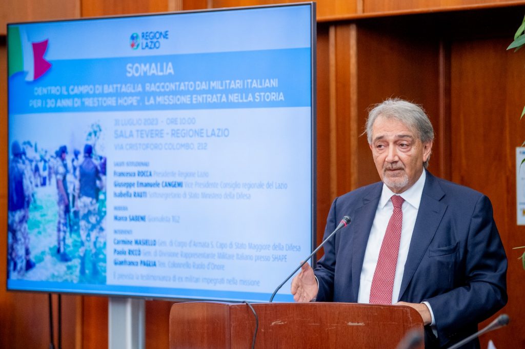 “La Regione Lazio non è soltanto sanità, ma un’Istituzione che ha il dovere di veicolare valori fondamentali. Per questo è stato importante commemorare, a distanza di 30 anni, la missione italiana in Somalia “Ibis”, all’interno di “Restore Hope”. Nel commemorare i nostri caduti mi preme ricordare la costante attenzione all’essere umano, la capacità di creare empatia, leggere i bisogni, stabilire un dialogo forte con le comunità e i loro leader delle nostre missioni di pace. Siamo lieti come Regione di esserci fatti megafono di questi principi”. Così si è espresso il governatore del Lazio, Francesco Rocca.