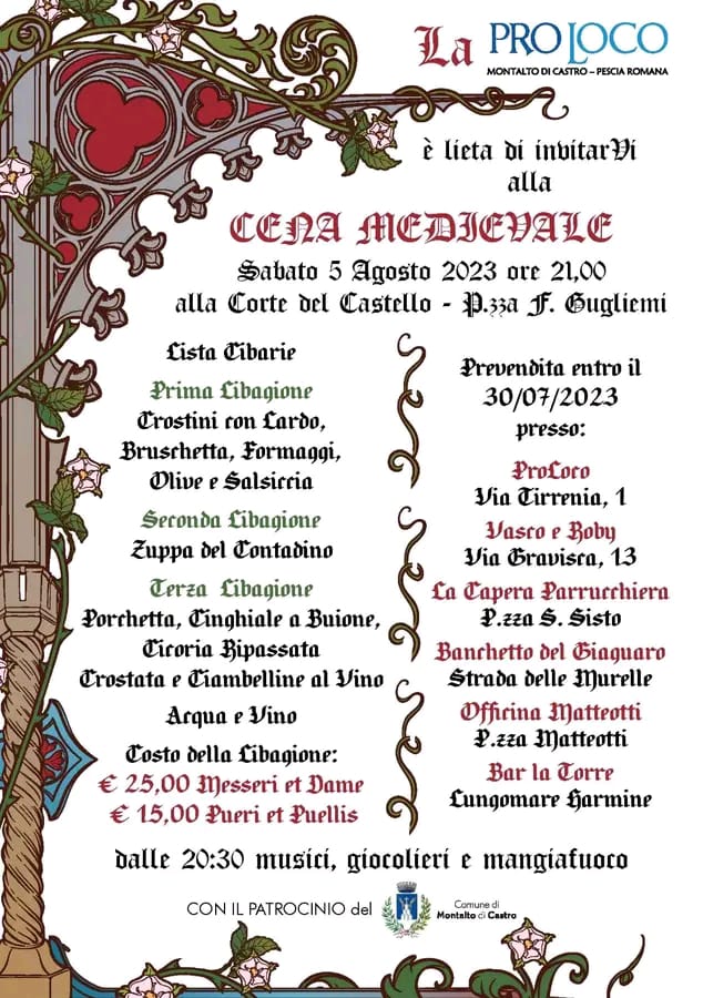 MONTALTO DI CASTRO – I manifesti affissi in giro per Montalto paese, Lido e Pescia Romano dalla Pro loco cittadina recita: “Siamo lieti di invitarvi alla prima edizione della Cena Medievale organizzata dalla Proloco sabato 5 agosto”.