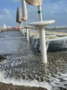 A Montalto Marina le immagini dello stabilimento Maremme sono impressionanti con l’acqua che è arrivata fino alla quarta fila di ombrelloni a quasi cinquanta metri dalla battigia normale.