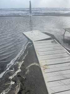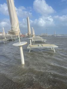 A Montalto Marina le immagini dello stabilimento Maremme sono impressionanti con l’acqua che è arrivata fino alla quarta fila di ombrelloni a quasi cinquanta metri dalla battigia normale.