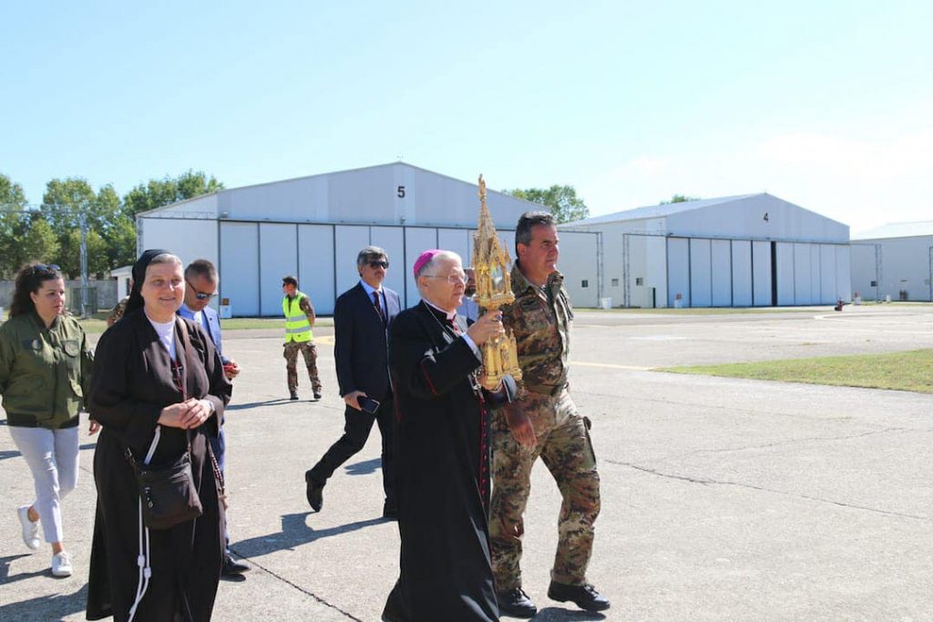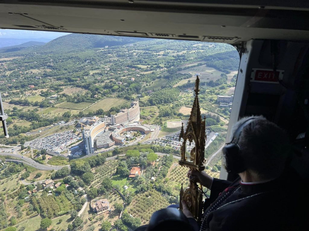 VITERBO – Questa mattina, il cuore di Santa Rosa ha spiccato il volo a bordo di un elicottero dell’Esercito per benedire dall’alto tutti i suoi fedeli. Il Vescovo di Viterbo S.E.R. Orazio Francesco Piazza con alcune delle principali autorità locali, si è recato presso l’eliporto Chelotti, dove l’elicottero NH-90, era pronto al decollo per compiere il sorvolo di Viterbo, Bagnaia, Grotte Santo Stefano, Soriano, San Martino al Cimino e Vitorchiano e i luoghi della fragilita, quali il Carcere, l’Ospedale Belcolle e le cliniche di malati e anziani.