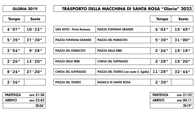 VITERBO – Riceviamo e pubblichiamo – Come scrivo ogni anno, le valutazioni sui tempi del trasporto sono solo uno spunto in più per far parlare i viterbesi della macchina di Santa Rosa, con curiosità e statistiche. Magari sono uno strumento ulteriore per fare delle considerazioni per migliorare sempre di più la sicurezza del trasporto da parte del capo facchino Rossi e il presidente del Sodalizio Mecarini.Il trasporto del 2022 è stato diverso nel percorso, ecco perché il confronto è stato fatto con il trasporto pre-covid, del 2019. Ebbene GLORA 2023 – ultimo trasporto per lei – ha battuto tutti i tempi di tutte le tratte di Gloria 2019. Il motivo è sicuramente l’approccio del facchino verso la macchina, la sente più sua ogni trasporto in più che fa e, dopo 6 trasporti, conosce bene i punti dove potrebbero esserci delle accollate pesanti. Rossi e Mecarini, l’esperienza maturata con Gloria, come piloti – permettetemi il paragone – conoscono pregi e difetti della Macchina che guidano. Sono sicuro che il prossimo anno, con la nuova macchina, i tempi saliranno.