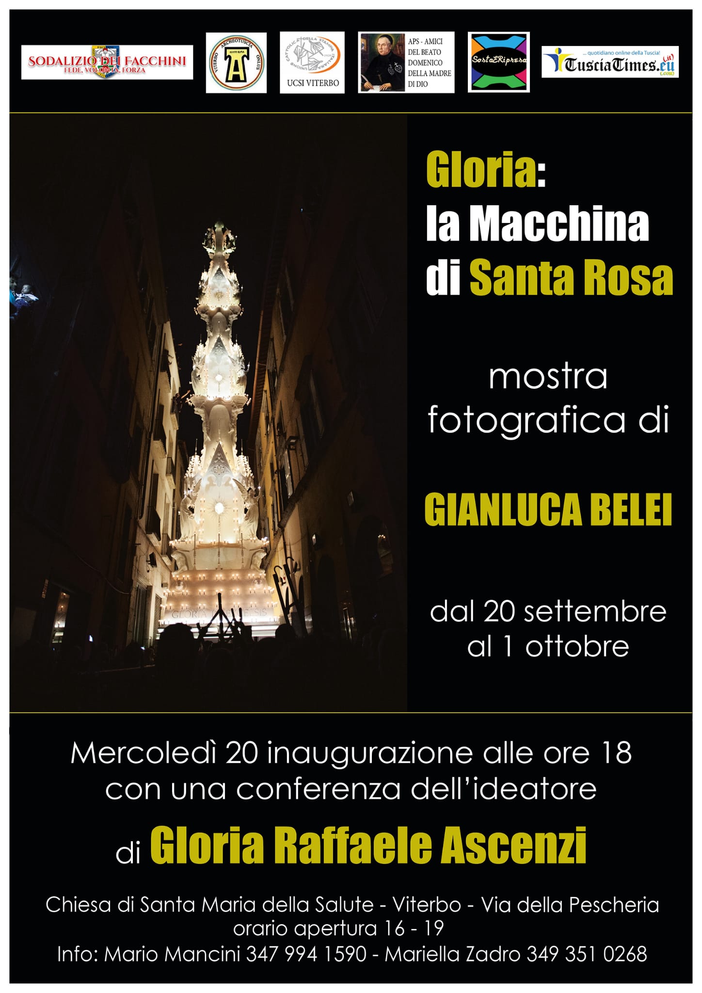 VITERBO – Gianluca Belei ha avuto la possibilità, e il privilegio, di vivere e documentare in ogni fase l’evento più sentito dalla città e della comunità di Viterbo: il trasporto della Macchina di Santa Rosa. Ha fotografato le cerimonie religiose e il corteo storico, le sedie private – come da tradizione – piazzate lungo il percorso, le persone che prendono posto già la mattina presto per le vie, pur di assistere qualche minuto al passaggio della loro Santa; la processione e le messe con i soli facchini, il pranzo con i parenti al parco, la vestizione in casa, gli attimi di intimità prima del trasporto, E, all’interno del cordone dei facchini, il loro sudore, lo sforzo e la sofferenza, la tenacia che scaturisce dalla devozione per Santa Rosa. La mostra, promossa tra gli altri dal Sodalizio dei Facchini di Santa Rosa, è composta da 12 pannelli (70×100 cm.) per un totale di 36 fotografie e sarà ospitata presso l’ex chiesa di Santa Maria della Salute a Viterbo, dal 20 settembre al 1 ottobre dalle 16 alle 19. All’inaugurazione del 20 sarà presente anche l’ideatore di Gloria e della nuova, Dies Natalis, Raffaele Ascenzi.