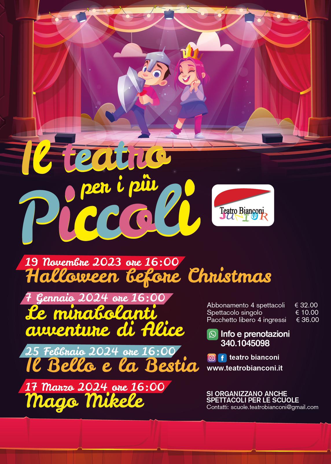 Da novembre a marzo: da Halloween before Christmas al Mago Mikele passando per Le mirabolanti avventure di Alice e Il Bello e la Bestia. Quattro divertenti e imprevedibili appuntamenti pensati non solo per i più piccoli ma per tutta la famiglia che potrà trascorrere pomeriggi all’insegna del divertimento, della sorpresa e della meraviglia che solo il Teatro può donare.La Stagione Junior si affianca quindi, come lo scorso anno, alla Stagione Teatro principale che propone un cartellone denso come non mai di appuntamenti importanti dove protagonisti saranno i migliori autori di commedie del panorama internazionale e nazionale al servizio delle attrici e degli attori più talentuosi e apprezzati in tutti i Teatri del nostro paese. Una Stagione piena di bellezza, ottimismo e divertimento.