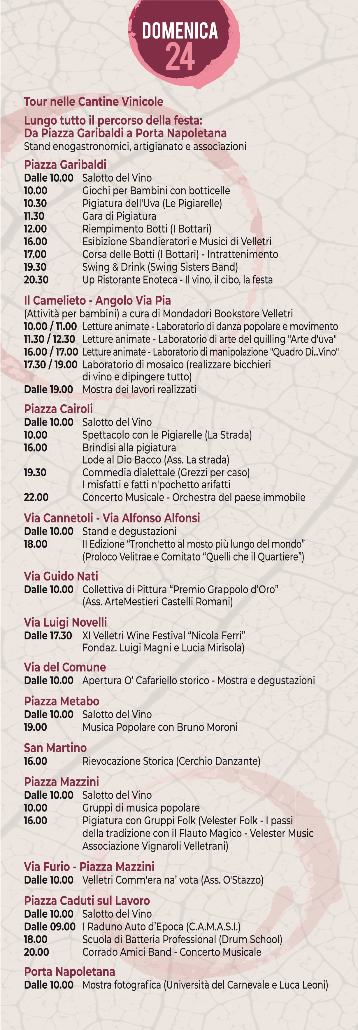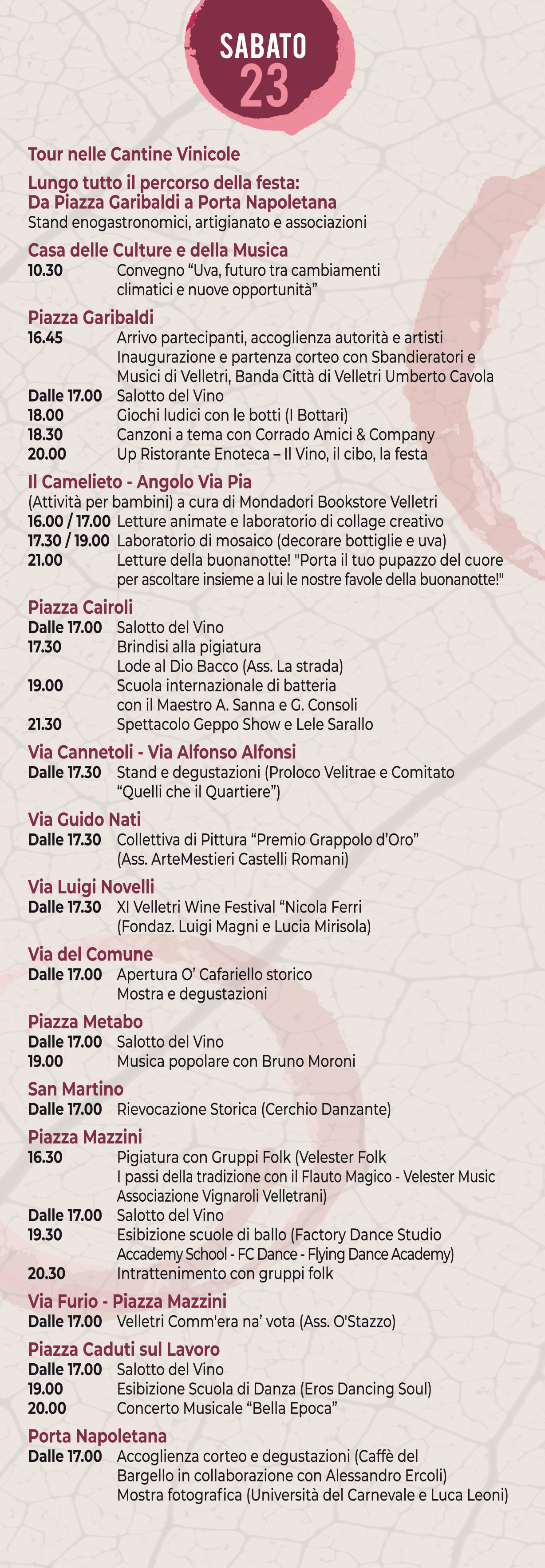 VELLETRI – Sabato 23 e domenica 24 settembre, a Velletri, si svolgerà la 92esima edizione della Festa dell’Uva e dei Vini con il suo carico di novità, eventi ed emozioni. Se il programma, già diffuso, riserva iniziative in tutto il centro storico, la grande novità di quest’anno è il “Salotto del Vino”.La terra è il nostro oro: Velletri, come tutti i Castelli Romani, sorge su un’area geografica di natura vulcanica, originata dal crollo del Vulcano Laziale avvenuta alcune centinaia di migliaia di anni fa. Le coltivazioni di vite e uva trovano quindi un terreno particolarmente fertile per crescere e svilupparsi, nella natura incontaminata delle campagne veliterne. Ecco allora che il territorio di Velletri è uno scrigno perfetto per la produzione di un ottimo vino e le cantine che vi lavorano sono tra le migliori al mondo. Il Salotto del Vino, che include ben quindici cantine del territorio, comprende tutte aziende di Velletri, coerentemente con l’obiettivo di valorizzare le realtà agricole del territorio, più le eccellenti dei paesi limitrofi. Sarà diffuso lungo tutto il percorso della festa, facendo tappa in ognuna delle principali piazze del centro storico veliterno: da Piazza Garibaldi a Piazza Cairoli, passando per piazza Metabo e per concludere a Piazza Mazzini e Piazza Caduti sul Lavoro. Un coinvolgimento a trecentosessanta gradi del centro storico (saranno presenti anche stand informativi in ogni piazza e un point di “Intorno” a Piazza Mazzini) per far rivivere il Corso della Repubblica e la strade ad esso collegate, in un week end di celebrazione delle tipicità veliterne. Il ticket per il “Salotto del Vino” sarà acquistabile a Piazza Garibaldi, Piazza Cairoli e Piazza Mazzini e comprende – al costo di 15 euro – una tracolla porta-bicchiere personalizzata, un calice da 30 cl, una brochure dedicata e il ticket delle degustazioni che darà diritto ad una degustazione per ogni cantina. Per sottolineare la ricercatezza e la qualità del percorso, ogni stand avrà a disposizione un sommelier – grazie alla collaborazione con Confagricoltura Roma – e le cantine che espongono faranno anche vendita diretta dei loro pregiati vini. Non resta che, programma alla mano, tuffarsi nella 92esima edizione della Festa dell’Uva e dei Vini e vivere Velletri in un week end indimenticabile sabato 23 e domenica 24 settembre.