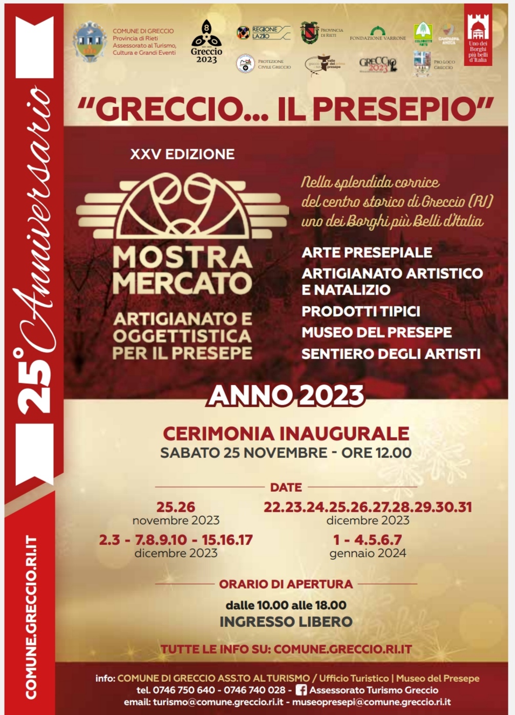 “Per i suoi 25 anni e in occasione dell’ottavo centenario della prima rappresentazione del Presepe di S. Francesco – prosegue l’Assessore al Turismo e alla Cultura del Comune di Greccio Fiorenzo Marchetti – vogliamo ancora una volta offrire ai visitatori un grande evento che nel corso degli anni si è radicato diventando un punto di riferimento dell’arte presepiale con migliaia di presenze provenienti da ogni parte di Italia.