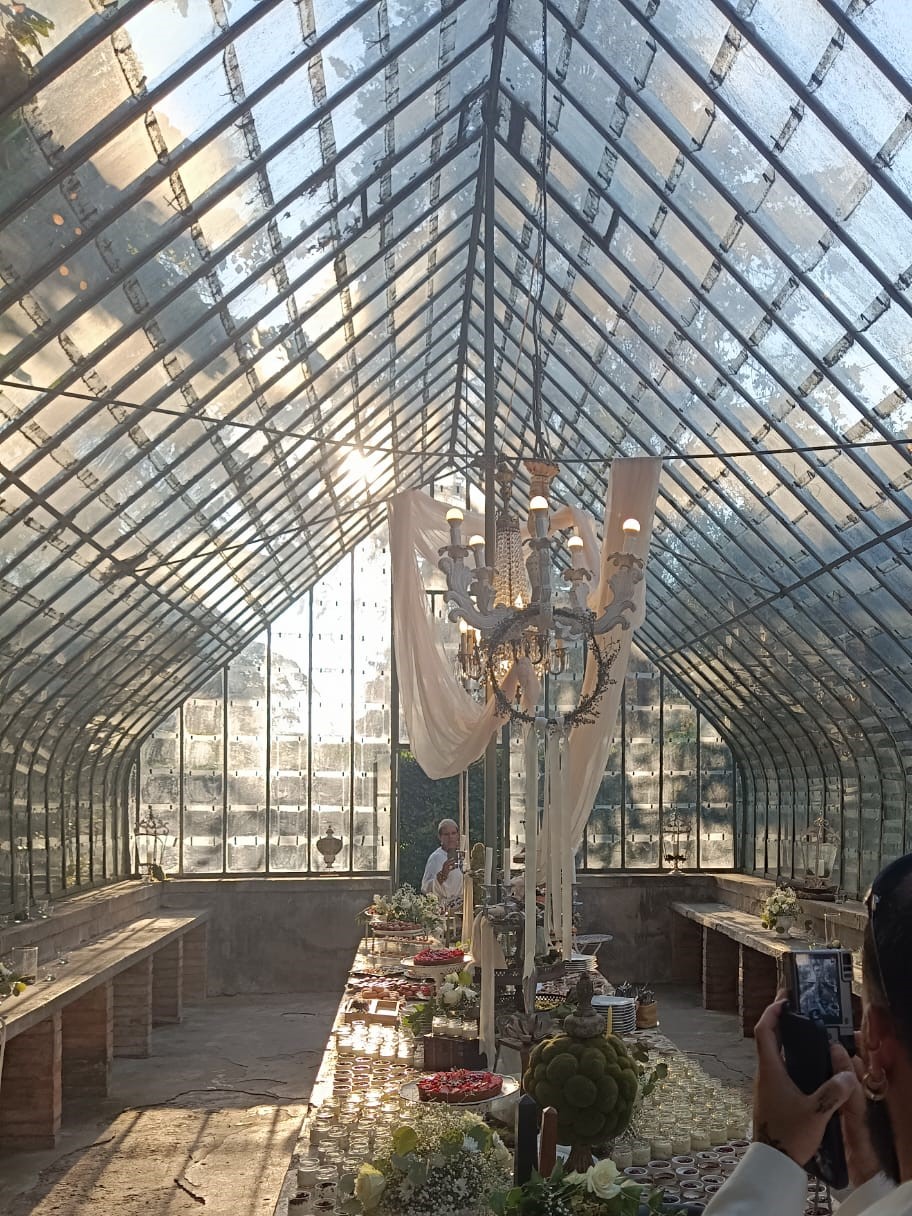 A consacrare il momento del dessert una serra con vetri originali del 1890, allestita con lampadari barocchi, lunghi nastri e candelabri da sogno.