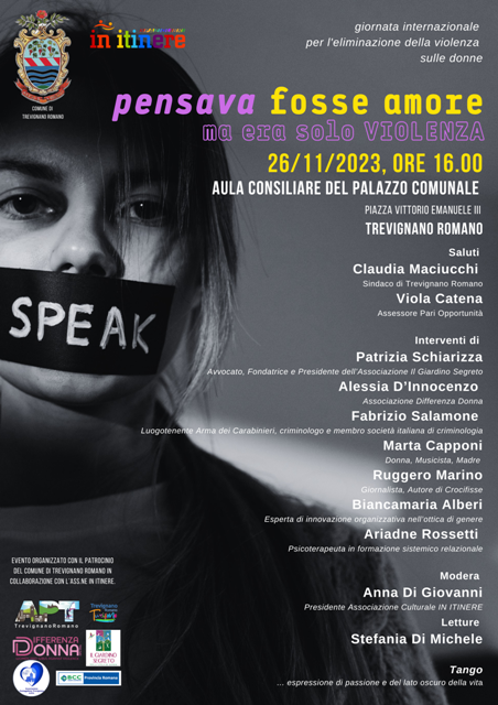 TREVIGNANO – ”Pensava fosse amore ma era solo violenza è il titolo dell’incontro organizzato dal Comune di Trevignano Romano, in collaborazione con l’Associazione In Itinere che si terrà il 26 novembre nell’Aula Consiliare del Palazzo della residenza comunale.