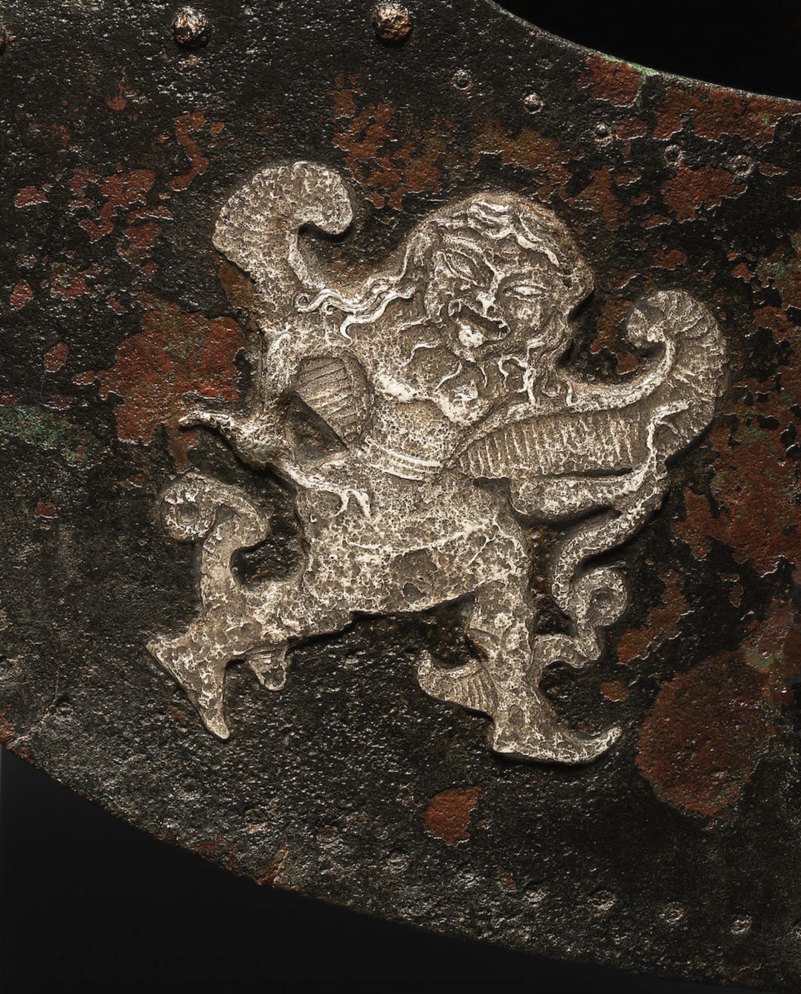 L’abilità richiesta per realizzare questo elmo, con i suoi estesi ornamenti decorativi e le sorprendenti applicazioni in argento, lo colloca in un gruppo raro degli elmi più impressionanti e importanti trovati in Italia.