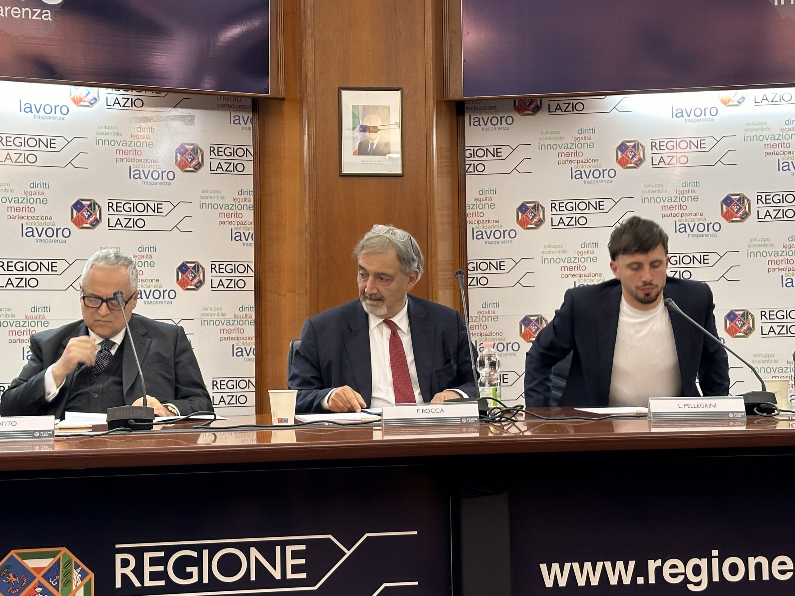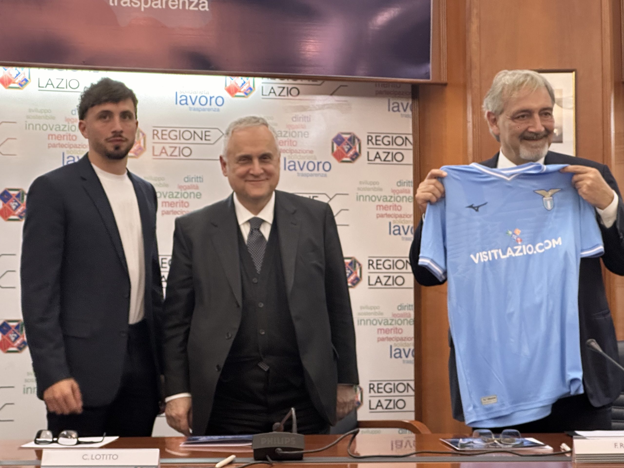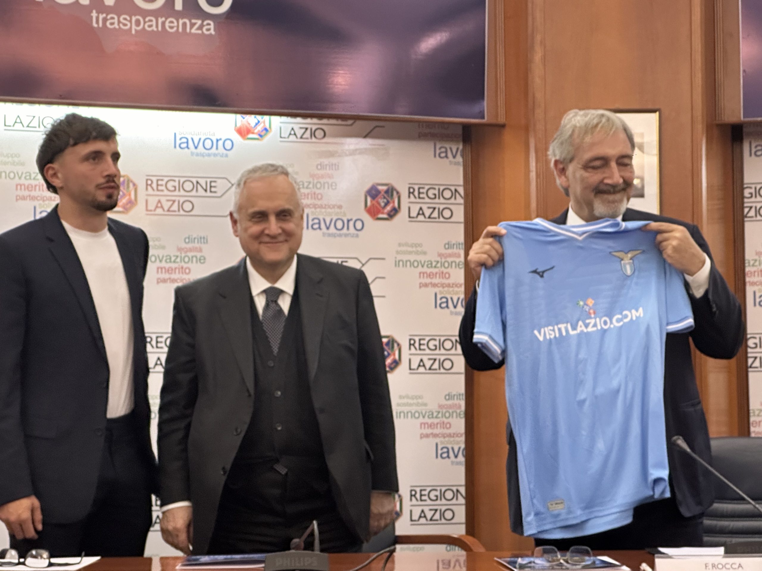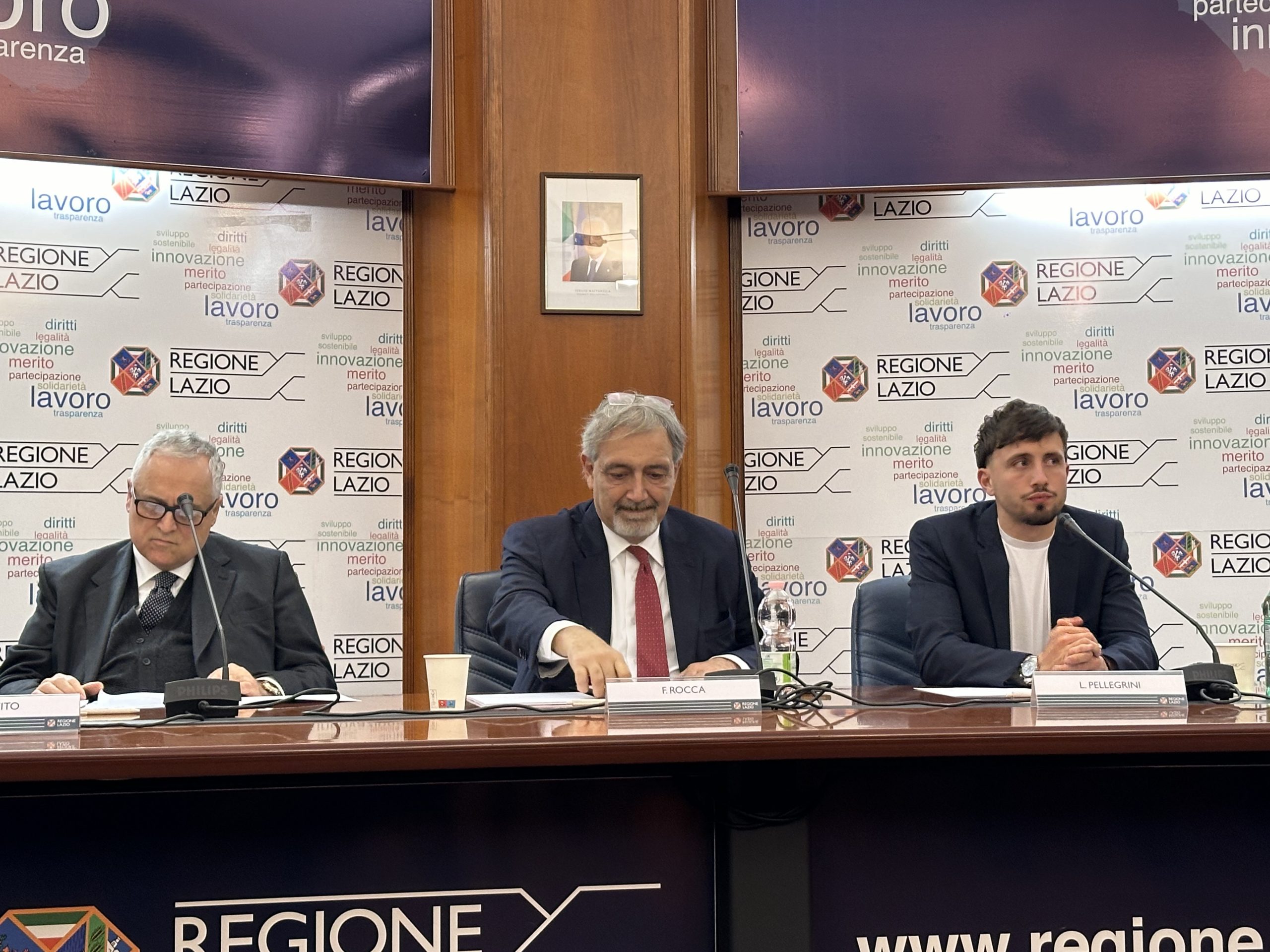 Nella conferenza stampa, presentata dal capo ufficio stampa della Presidenza della regione Daniele Di Mario, sono intervenuti il presidente della Regione Lazio, Francesco Rocca, il presidente della Ss Lazio, Claudio Lotito, e il calciatore Luca Pellegrini, in rappresentanza della squadra biancoceleste.